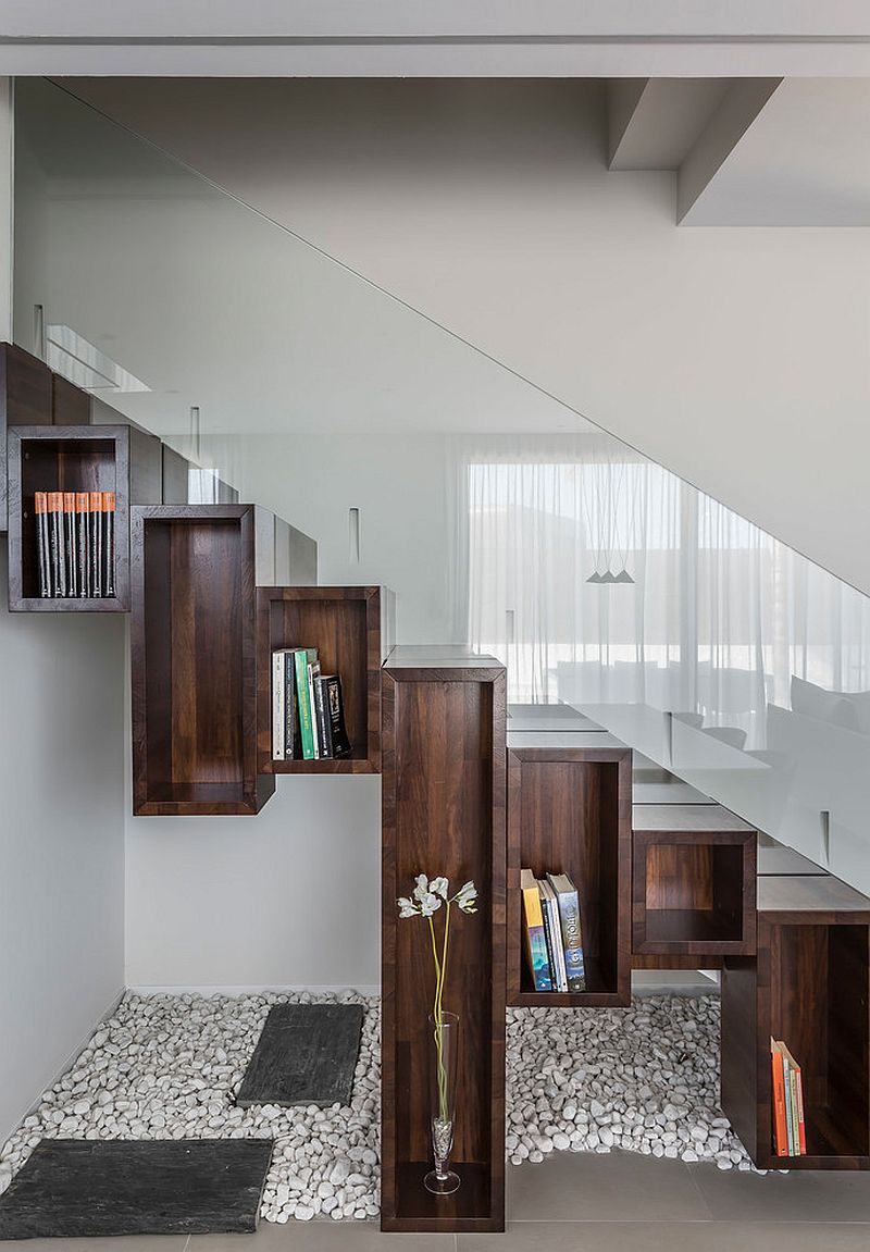 Why not move beyond the usual glass and metal railings and try something new? Imagine a staircase railing that also doubles as extra storage!