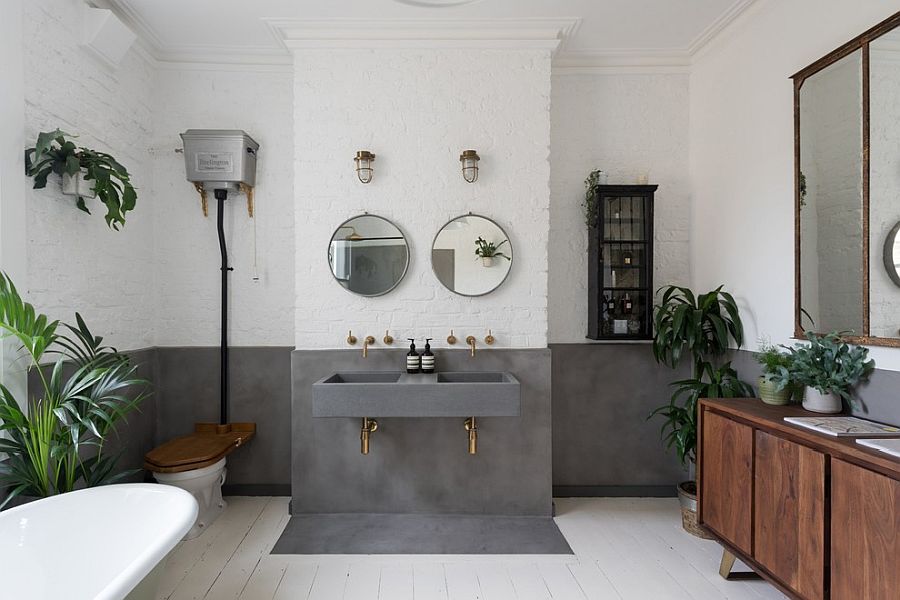 You can obviously lean into an industrial style, especially in a bathroom with concrete and brick wall finishes. I also love how a little bit of aging wood brings in a rustic feel, while a shabby chic look finds its place when you keep the background neutral and add just the right decor.