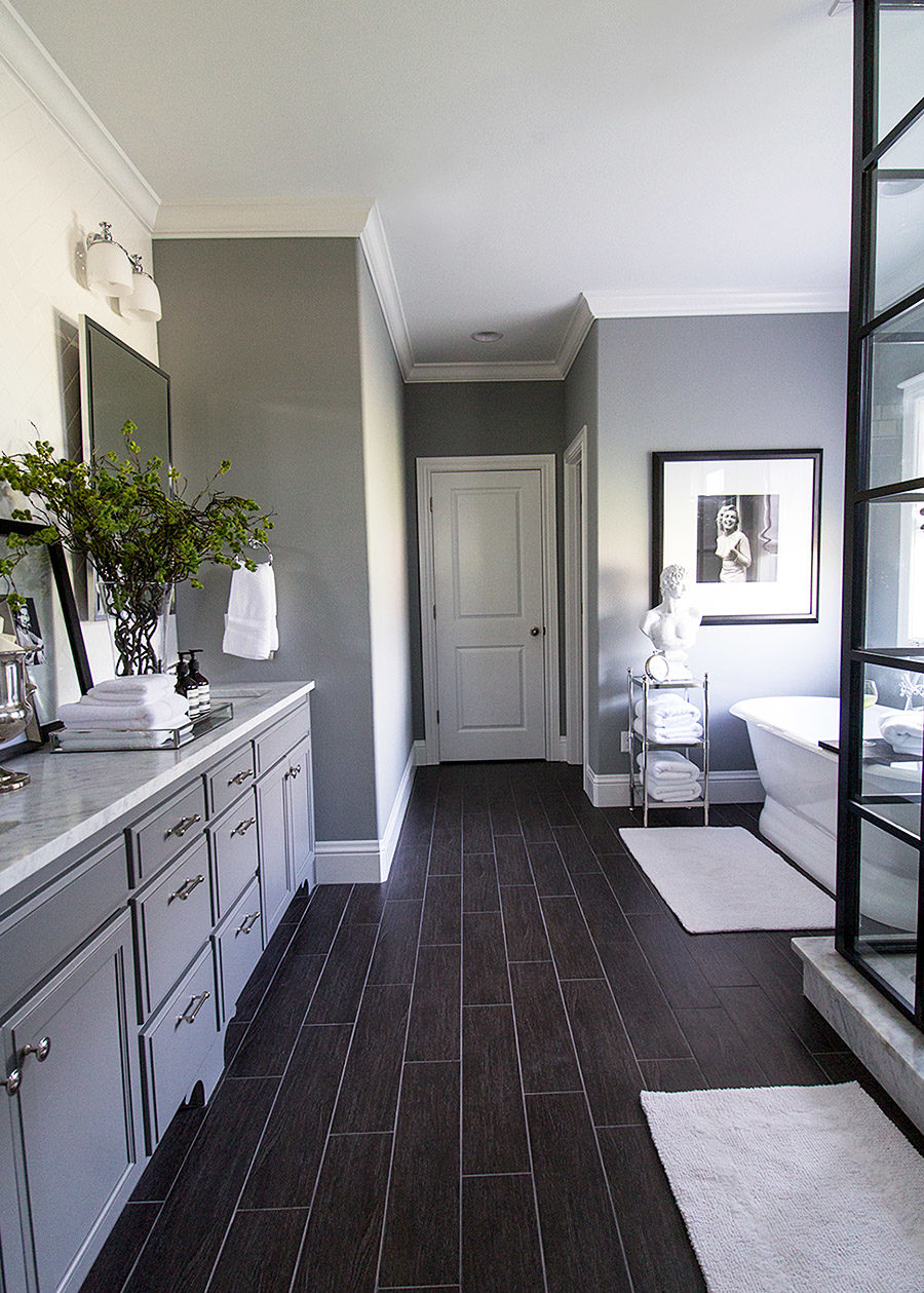A classic bathroom design with dark wood-look tile floors for a masculine touch.