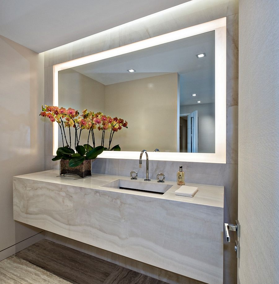 Adding pendants and sconce lights near the vanity and mirror can really add to that cheerful feeling.