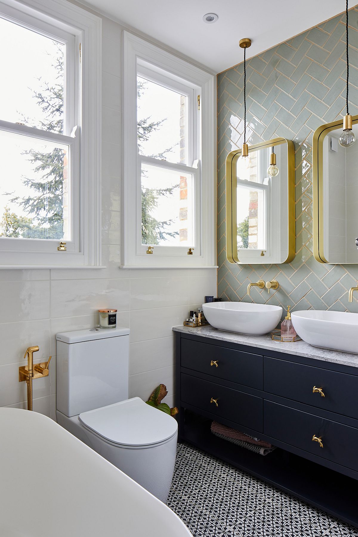 If you keep the bathroom backdrop a crisp white, you can use a blue vanity to create some gorgeous contrast and a smart focal point that brings in such a cheerful feeling. I love to see metallic accents from the handles and surrounding light fixtures that turn it into the showstopper.