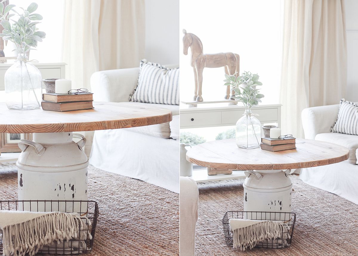 I just love how the milk can with its distressed white finish serves as the base, while the wood tabletop has a more modern and polished feel.