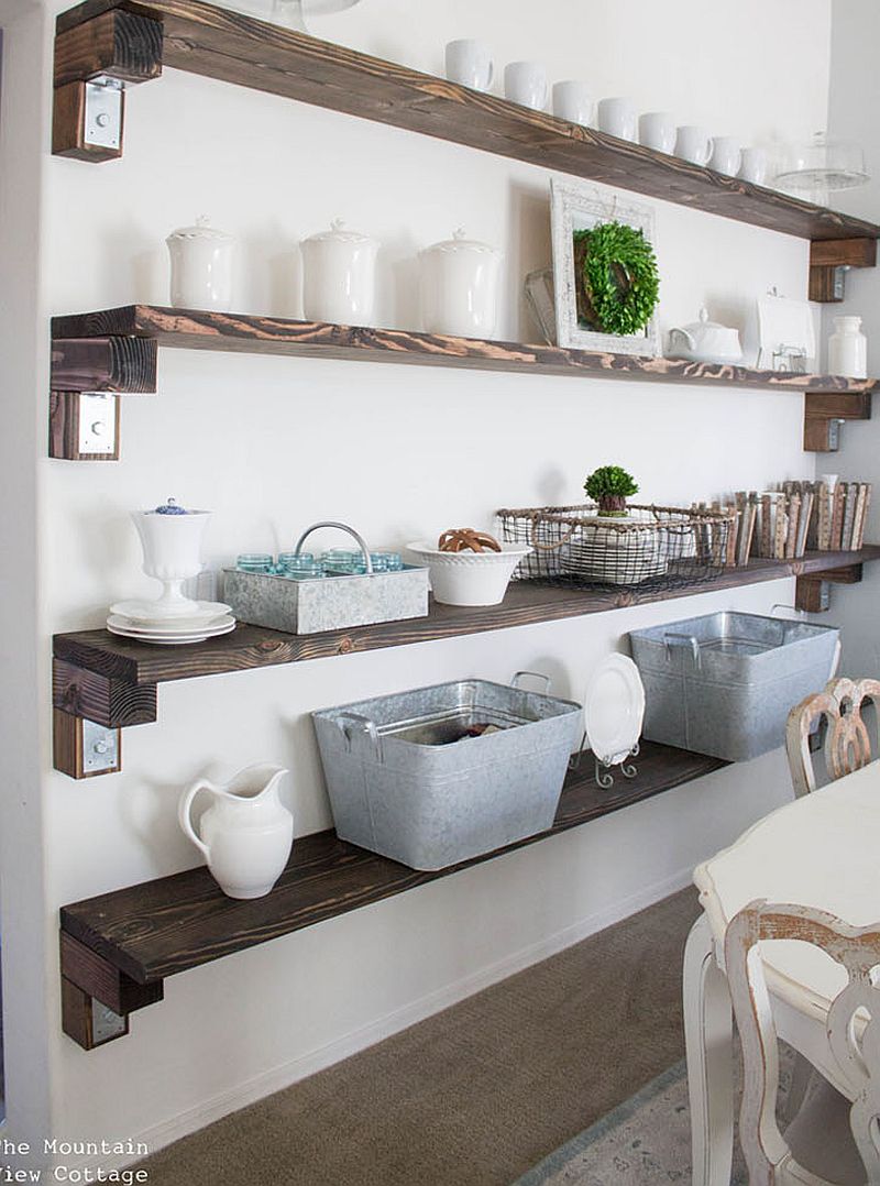 You can go down the path of making a beautiful and slim farmhouse display in the kitchen with sleek floating wooden shelves.