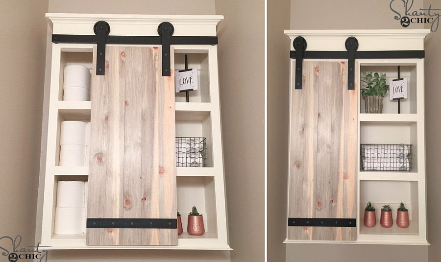 A small cabinet that can be wall-mounted and features a sliding wooden barn-style door is a piece of decor that’s just as perfect for a small kitchen as it is for a tiny bathroom.