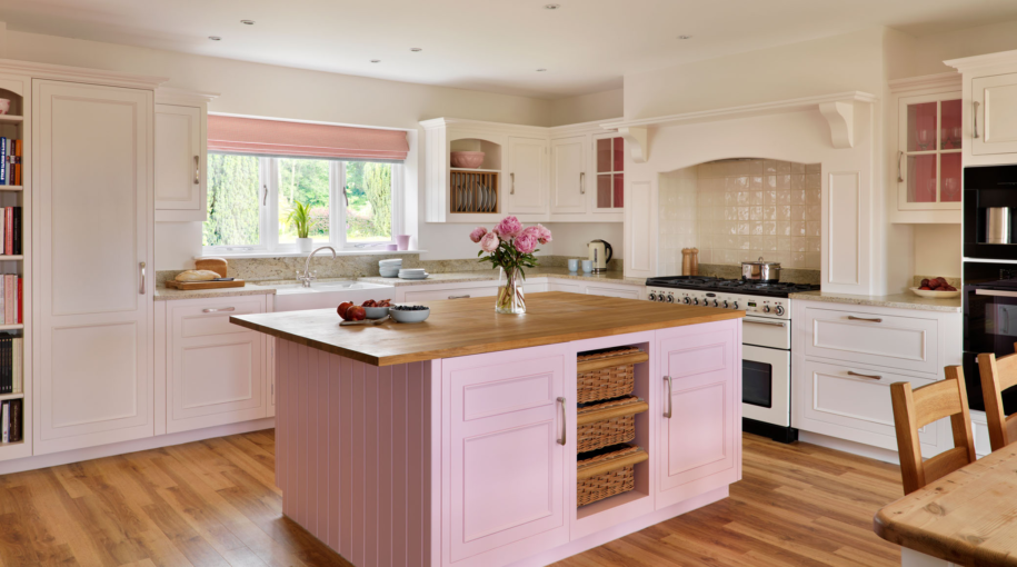 In this case, it’s the pink kitchen island, which provides fantastic storage and serves as an important decor feature.
