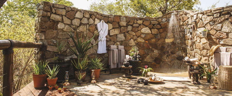 A partly covered outdoor bathroom makes the shower the main attraction of the room.