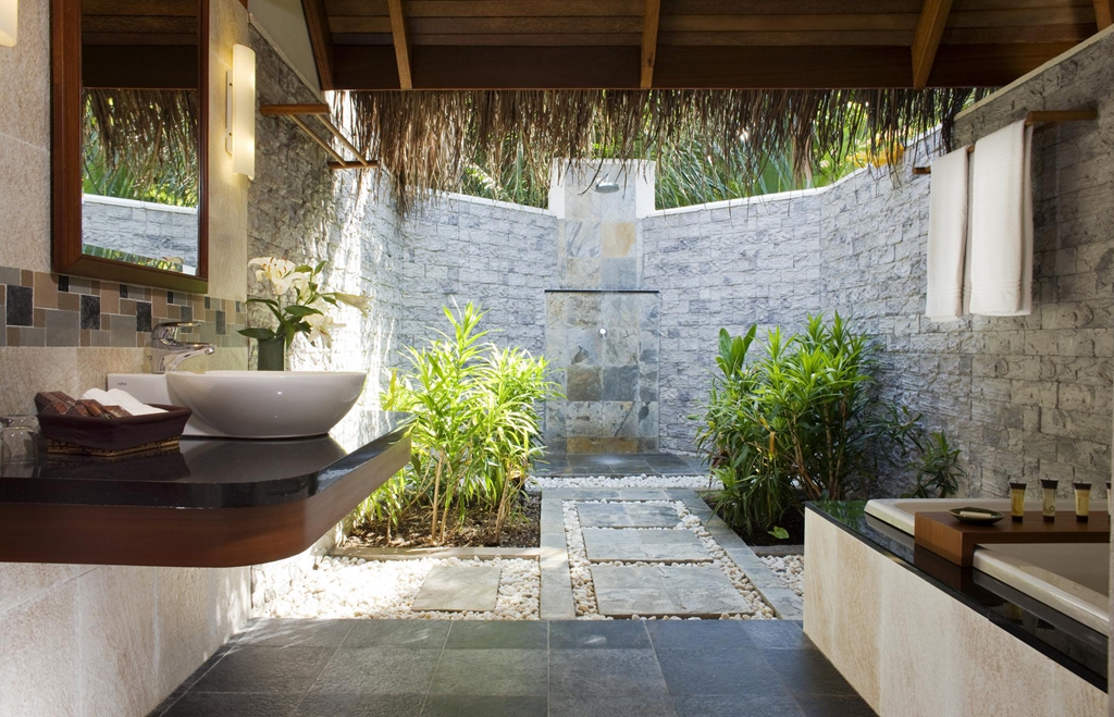 A large outdoor space that’s been converted into a bathroom captures a sense of both privacy and luxury, thanks to the soft color tones and the open area!