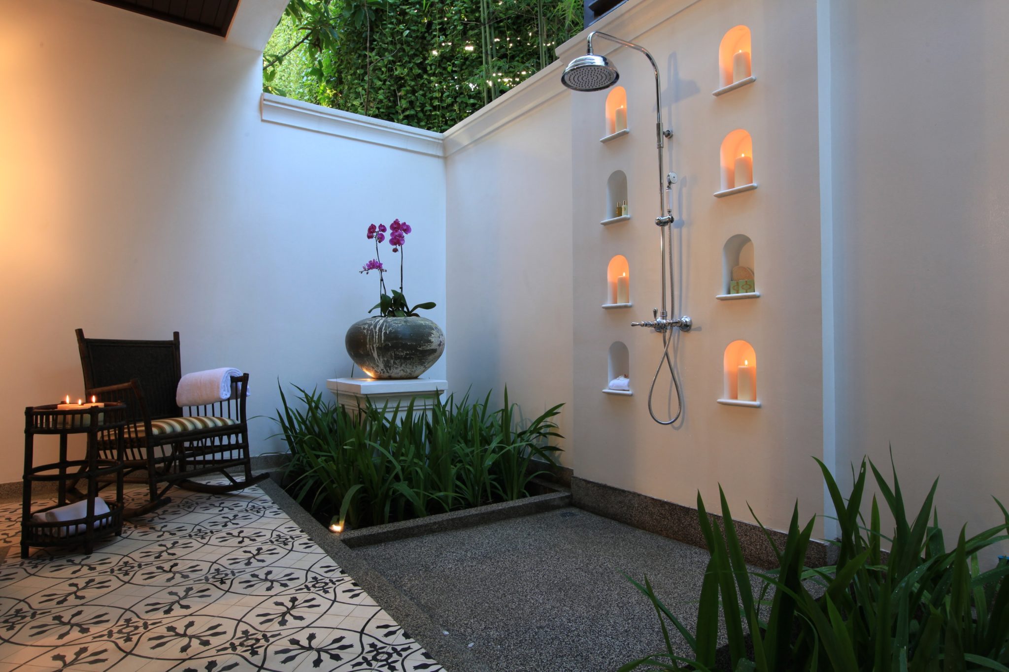 A partly enclosed outdoor shower with white walls creates such a calm setting, made even more peaceful by the lit candles.