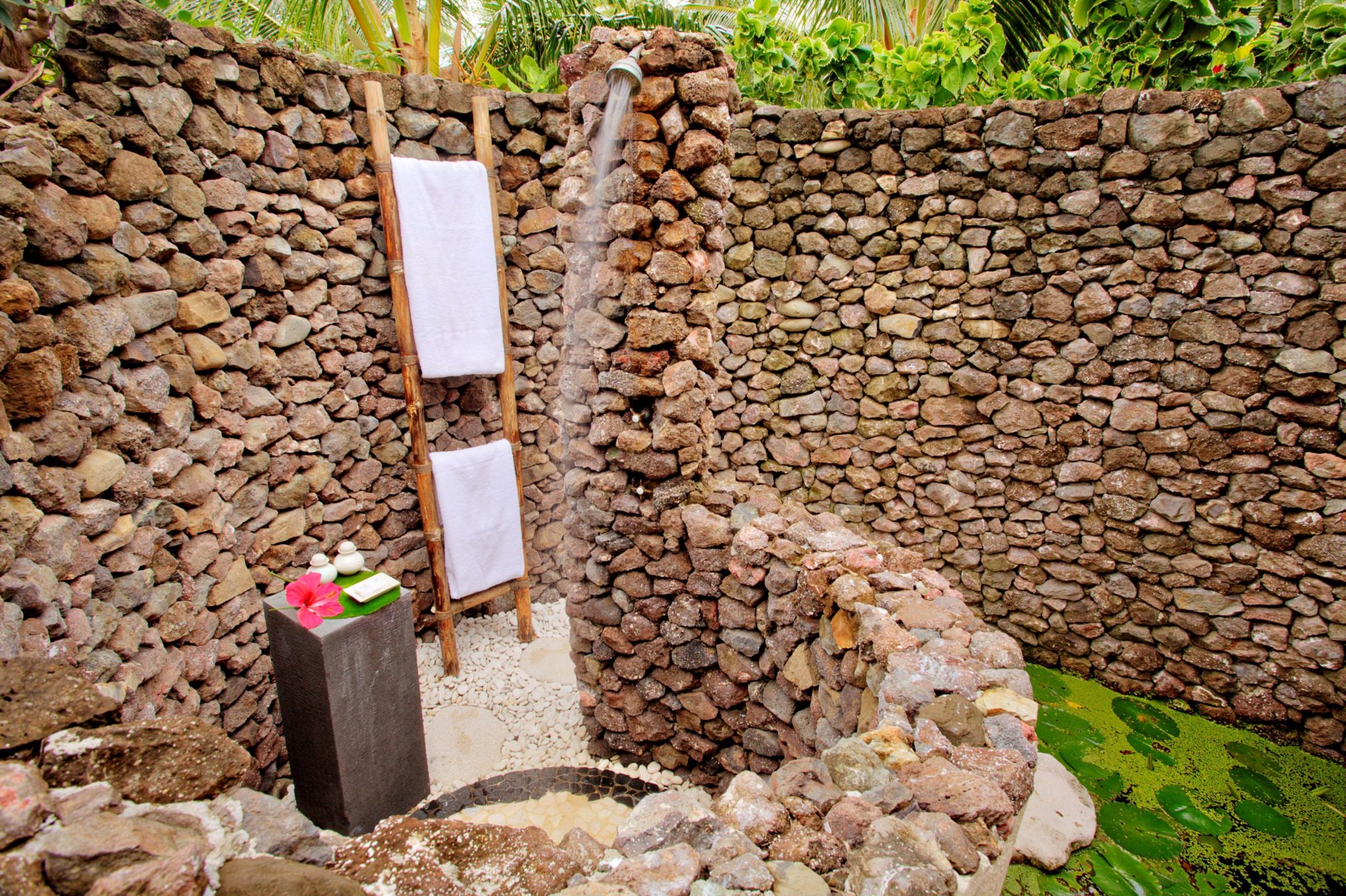 I think the green plants all around create such a lively atmosphere, and the stone shower itself feels like it’s part of the natural landscape.