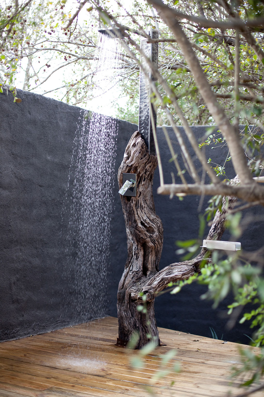 It has a big log holding up the sleek silver shower, and the wooden floor creates a great contrast with the concrete walls.