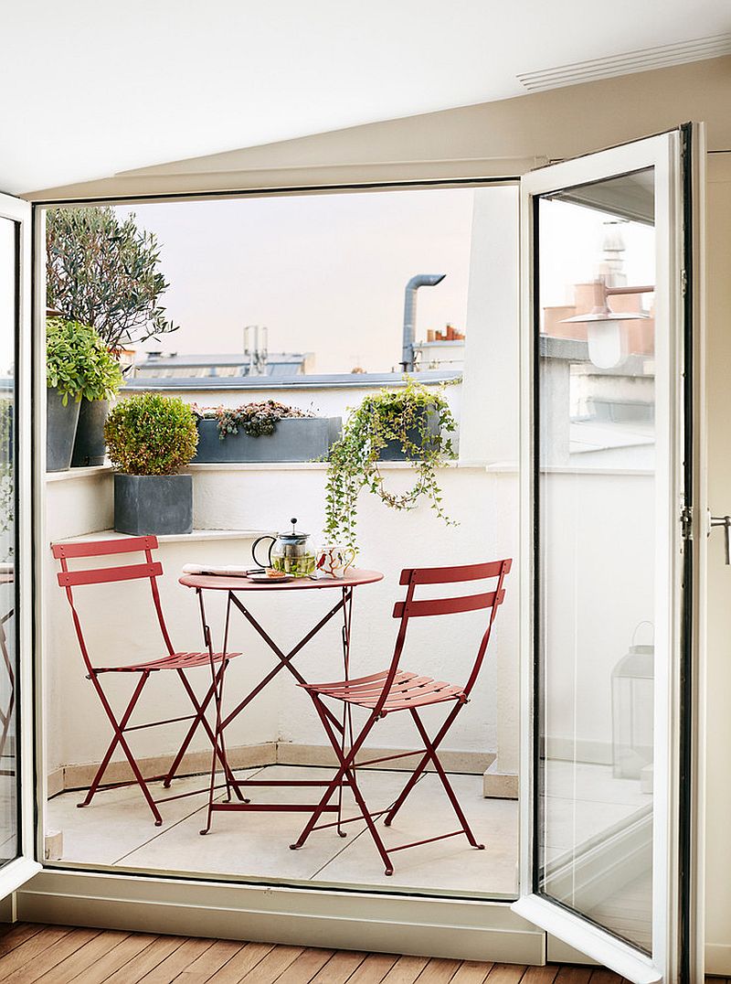 Don’t forget to use your walls for stacking things up to make a tiny balcony that feels both welcoming and absolutely beautiful.