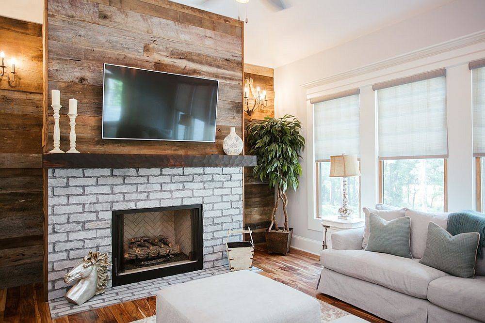 You can bring a different material and aesthetic to the contemporary space by pairing these redbrick fireplaces with rugged wooden mantles and smart decorative pieces.