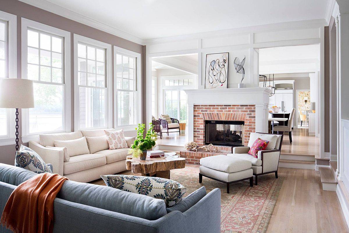When you have a brick fireplace, it’s only natural that it becomes an even more eye-catching feature in a modern living space filled with neutral colors and polished finishes.