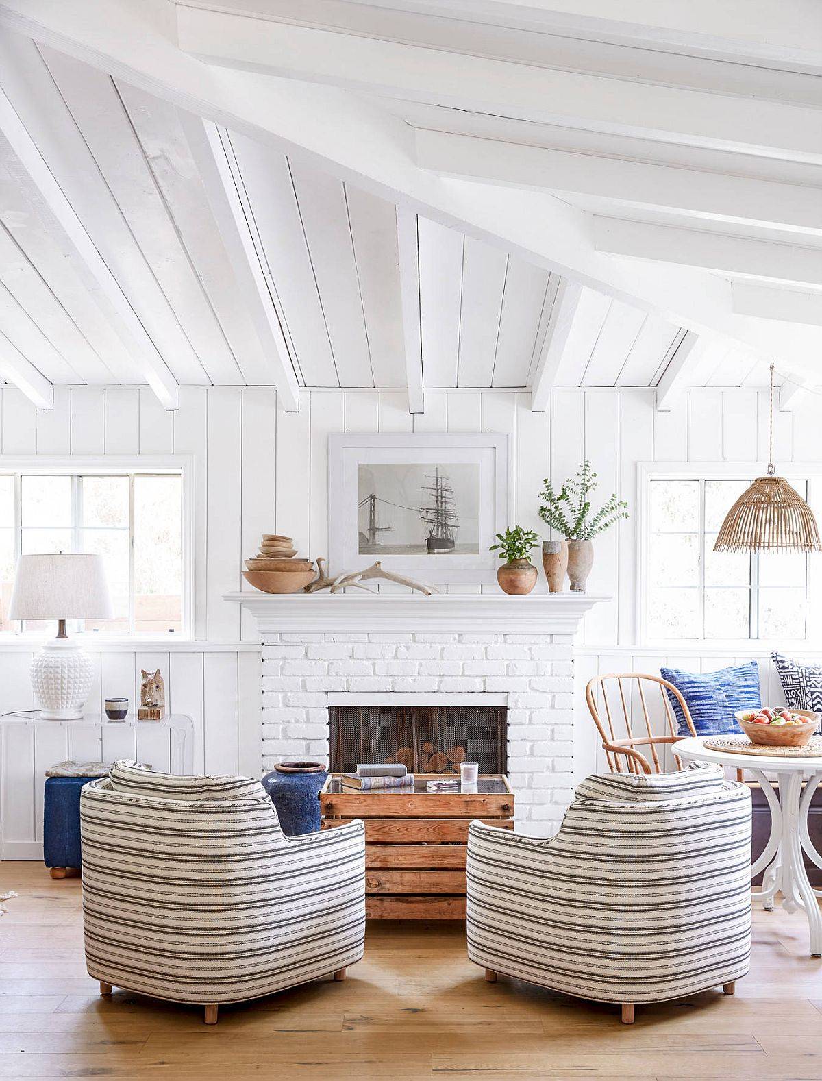 This modern beach style living room is just gorgeous in white with a blue carpet and brick fireplace. [From: Norman Design Group]