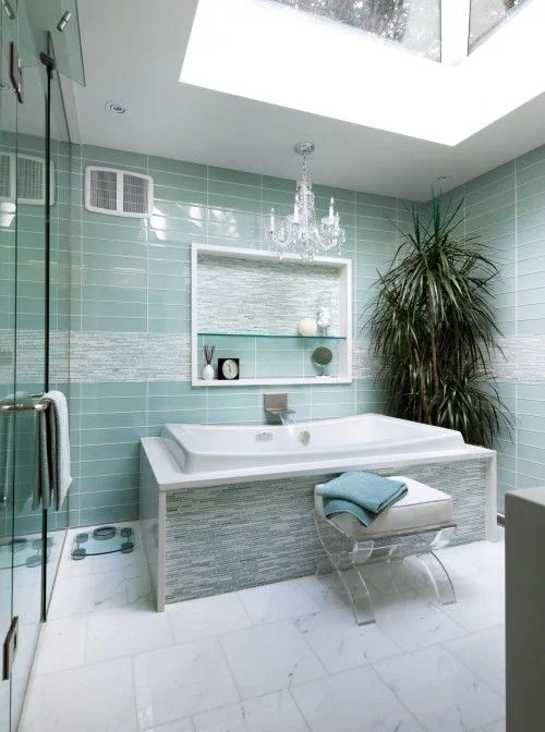 For minimalist bathrooms, classic monochrome and neutral color palettes are very popular. But if you want a stunning feature in a contemporary bathroom, look for vibrant teals, royal blues, and mint greens.