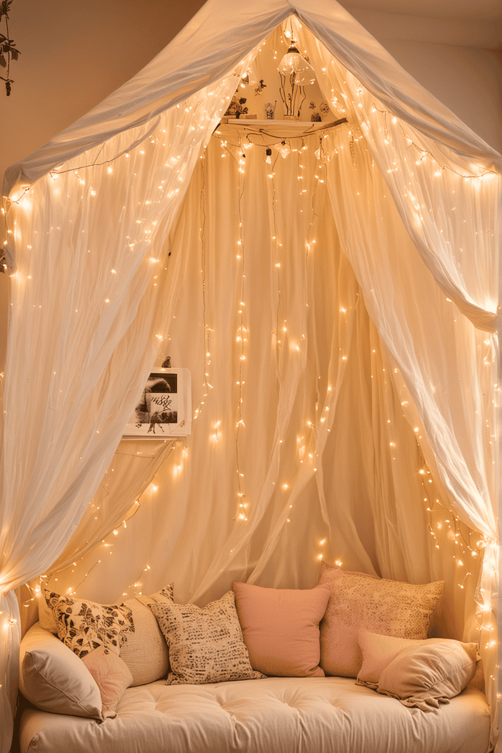 To set this up, choose a lightweight fabric that suits your interior design. Secure the fabric to a ring or hoop and hang it from the ceiling to form a drape. Then, add some comfortable cushions, a soft throw blanket, and a small side table for your books or tea.