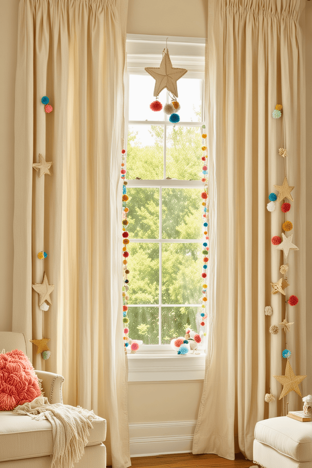 To implement this concept, start by choosing a curtain fabric that complements your room’s color scheme. Next, select pom poms or star appliques in contrasting yet harmonious colors.