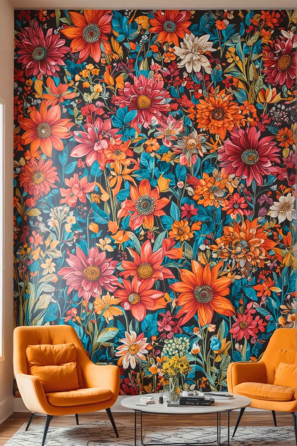 Apply adhesive and carefully smooth the wallpaper onto the wall, removing any air bubbles. Finish by trimming the edges and enjoying your newly enchanted living room!