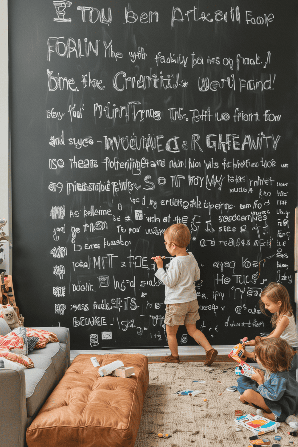 Once it is dry, the real fun begins: gather colorful chalk or magnetic letters, and let your imagination roam freely. Whether it is for jotting down grocery lists, crafting small masterpieces, or keeping children entertained, this dynamic decor concept adds personality and usefulness to any living room.