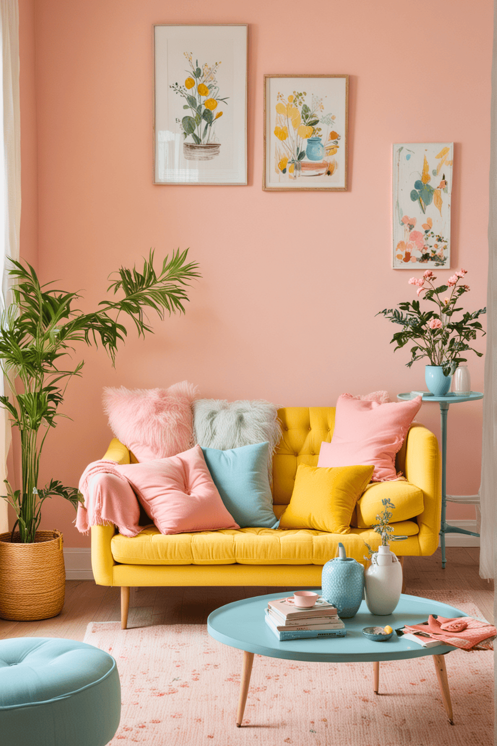 Next, choose furniture that complements these tones. A striking yellow sofa or a pastel pink armchair can serve as excellent focal points.