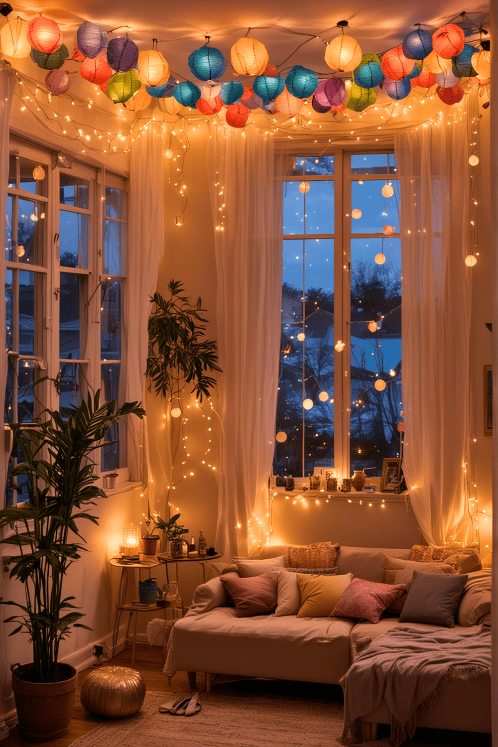 Twinkling lights and vibrant lanterns are perfect for adding a touch of enchantment to your living room. They create a warm, inviting atmosphere, making the space feel cozy and magical.