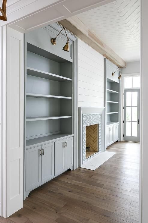 White Shiplap Fireplace with Built-In Bookcases and Patterned Tile