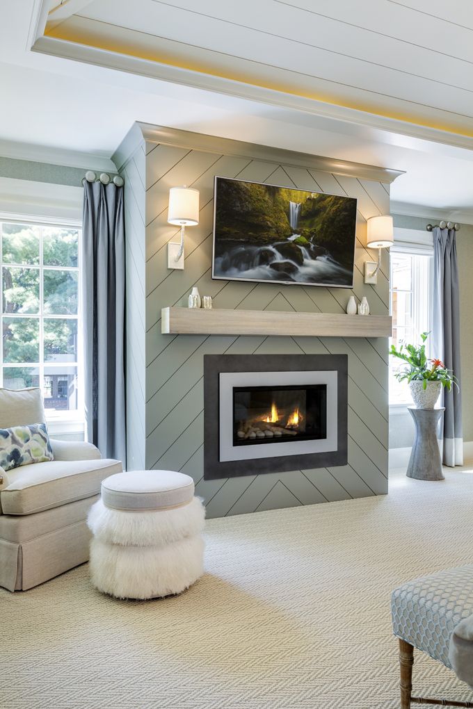 This chevron shiplap fireplace offers a fresh take on the standard horizontal layout, introducing visual interest and a sense of movement. The sleek light wood mantel and symmetrical sconces frame the fireplace perfectly, achieving a polished, high-end appearance.