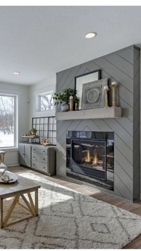This gray chevron shiplap fireplace introduces a sleek, geometric element to the living room. The floating mantel contributes to a minimal and modern design, while the soft neutral color scheme fosters a warm and welcoming environment.
