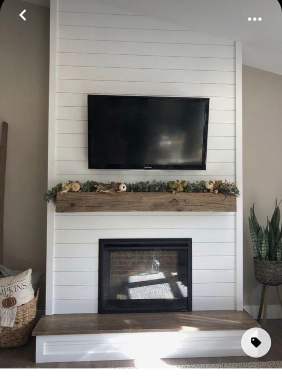 Tall White Shiplap Fireplace with Rustic Mantel and Modern Décor
