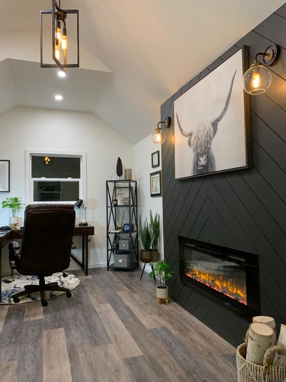 This bold black chevron shiplap fireplace instantly adds drama and texture to the room. The sleek electric insert and industrial sconces combine to create a cozy yet modern atmosphere, making it a perfect fit for a home office or a versatile living space.