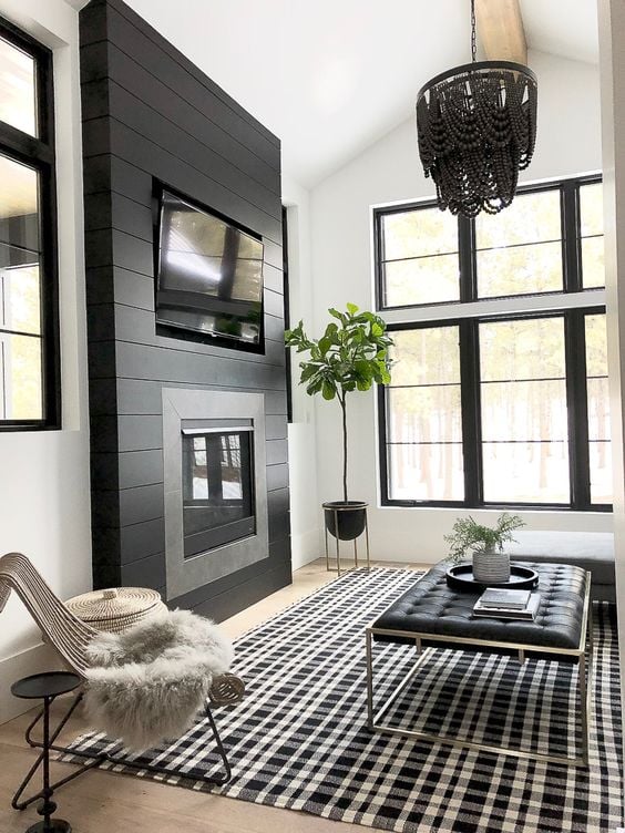 This dramatic black shiplap fireplace makes a powerful statement in a minimalist living room with high ceilings. The clean lines, gray tile surround, and wall-mounted TV maintain a sleek design, while a black chandelier ties the entire space together.