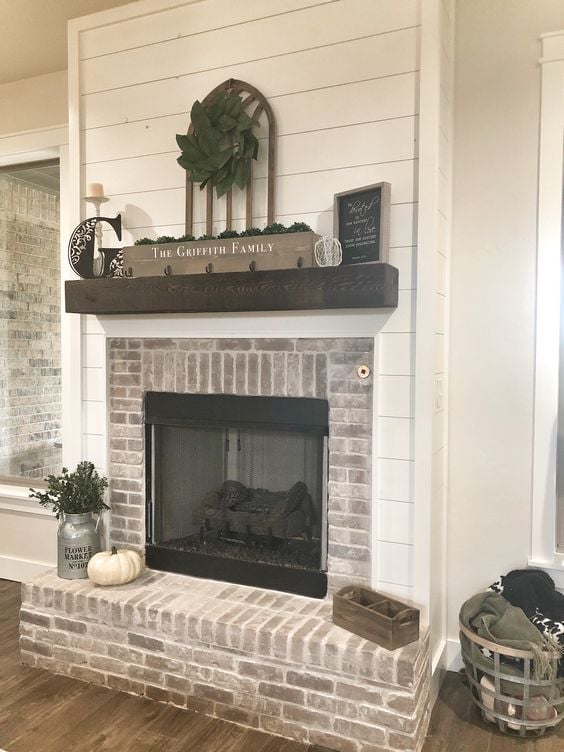 White Shiplap Fireplace with Brick Surround and Rustic Mantel
