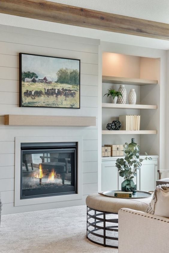 This light gray shiplap fireplace is an ideal choice for achieving a soft, modern living room aesthetic. A sleek floating mantel maintains a minimalist design, and the built-in shelves offer both storage and a place to display curated decor.