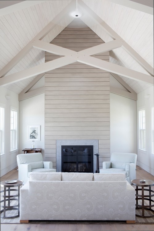 Vaulted White Shiplap Fireplace with Coastal Accents