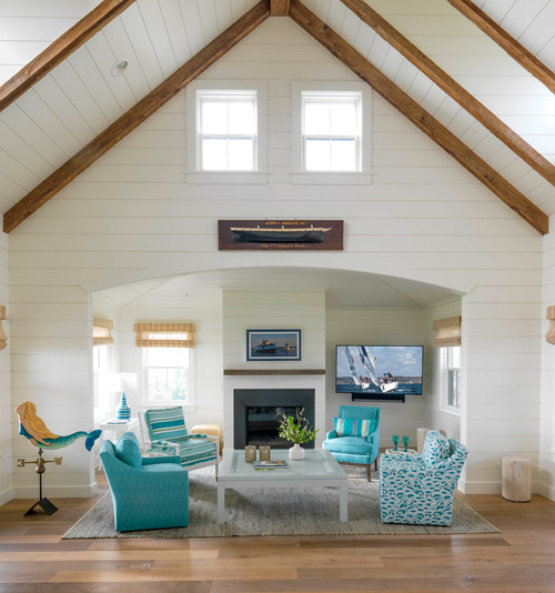 This beautiful vaulted room is defined by a full wall of white shiplap, which includes a simple fireplace surround that keeps the focus on the room’s architecture. Rustic beams and bright turquoise furniture give the space a relaxed, coastal atmosphere.