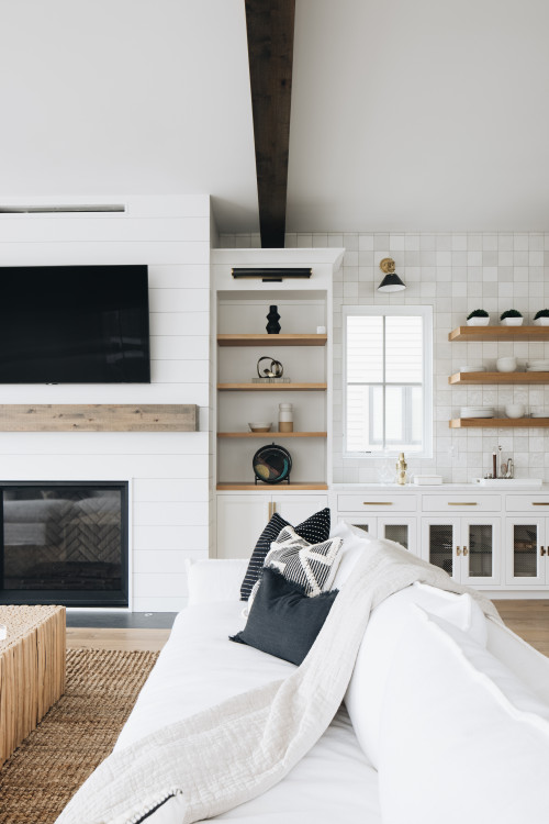 This bright and light living space pairs a classic white shiplap fireplace with built-in shelving for storage and display. A nearby bar area, complete with open wood shelving and a tile backsplash, adds a modern and functional element.