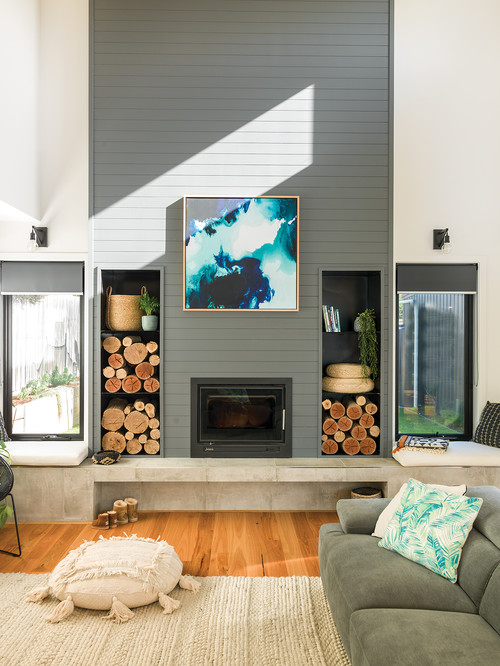 This remarkable fireplace features a beautiful blue shiplap, but the real point of interest is the integrated wood storage. The symmetrical built-in boxes contrast with the asymmetrical arrangement of items on the shelves, creating a sense of visual appeal without feeling overwhelming.