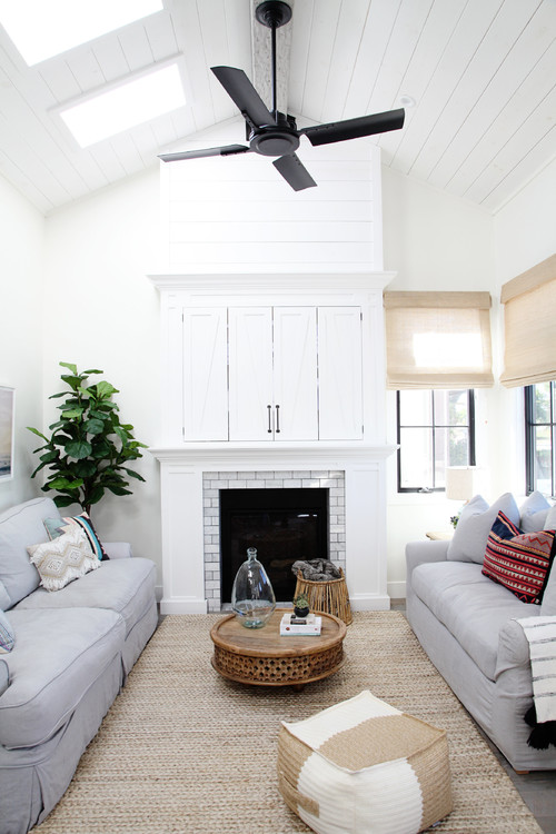 This clever design masterfully blends style and practicality, featuring a shiplap fireplace that conceals a TV behind charming barn-style doors. A subway tile surround adds a subtle texture, while the tall shiplap and skylights contribute to a bright and airy atmosphere.