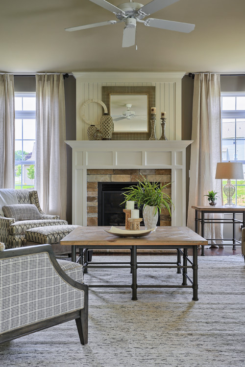 This airy living room showcases a white shiplap fireplace enhanced with a unique pebble tile surround that adds texture and visual interest. The natural wood mantel warms up the design, while the neutral color palette maintains a calm and inviting atmosphere.