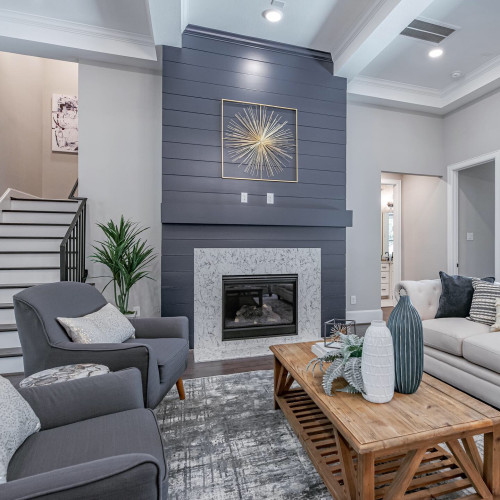 This dramatic navy shiplap fireplace immediately captures attention and draws the eye upward, establishing itself as the room’s centerpiece. A marble tile surround adds an elegant contrast, while gold artwork and a coffered ceiling further elevate the design.