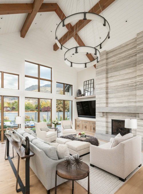 This elegant design employs graywashed shiplap, which provides a subtle, weathered appearance while preserving a clean and modern aesthetic. The vaulted ceiling and exposed trusses add architectural interest, making the fireplace wall the undisputed centerpiece of the room.