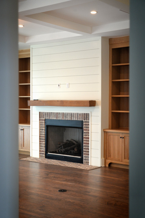 Simple White Shiplap Fireplace with Brick Accent and Wood Mantel