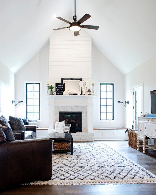 Tall White Shiplap Fireplace with Brick Surround in Vaulted Room