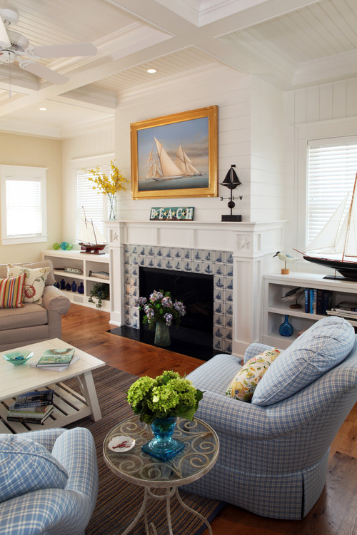 This coastal-themed shiplap fireplace exudes a light and breezy feeling, thanks to its crisp white paneling and a playful sailboat tile surround. The built-in shelves are styled with nautical decor, infusing the space with charm and personality.
