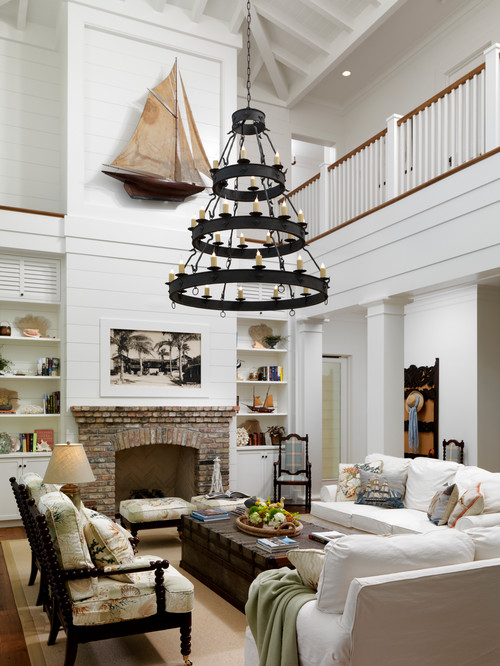 This magnificent two-story fireplace marries crisp white shiplap with a classic brick surround, achieving a timeless coastal aesthetic. Its soaring height naturally draws the eye upward, while built-in shelves and an oversized two-story chandelier make the room feel grand yet approachable.