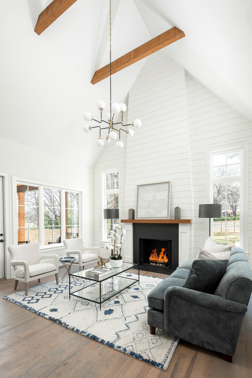 This impressive design capitalizes on the vaulted ceiling by running white shiplap all the way to the top, forming a dramatic centerpiece. The warm wood mantel and black firebox introduce contrast, while a modern chandelier and exposed beams unify the space.