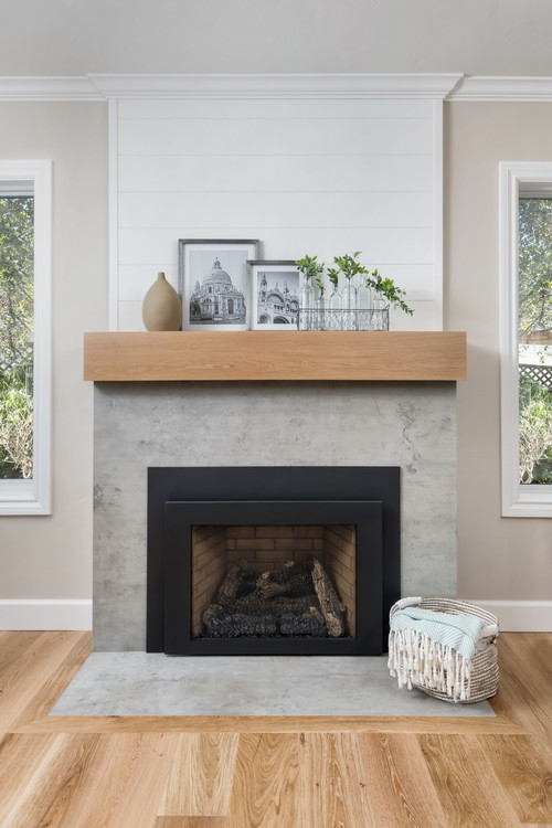 Modern Concrete and White Shiplap Fireplace with Light Wood Mantel