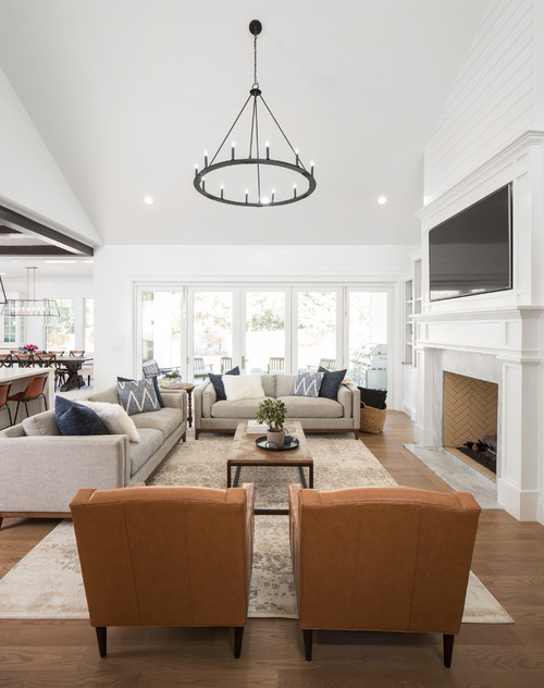 This sophisticated design combines a white shiplap fireplace wall with an elegant herringbone tile surround, resulting in a timeless look. The integrated TV placement makes the space highly functional, while the open floor plan and large windows ensure it remains light and airy.