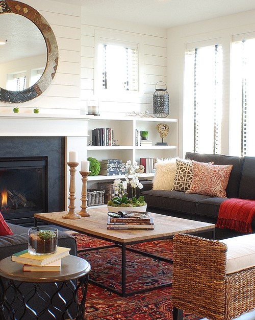 White Shiplap Fireplace with Built-In Shelves and Cozy Décor