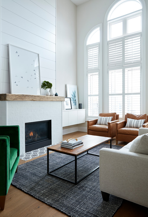 This tall shiplap fireplace is a striking centerpiece, reaching nearly to the ceiling and drawing the eye upward. The rustic wood mantel adds warmth to the clean, modern aesthetic, and the white brick surround keeps the look fresh alongside white walls.